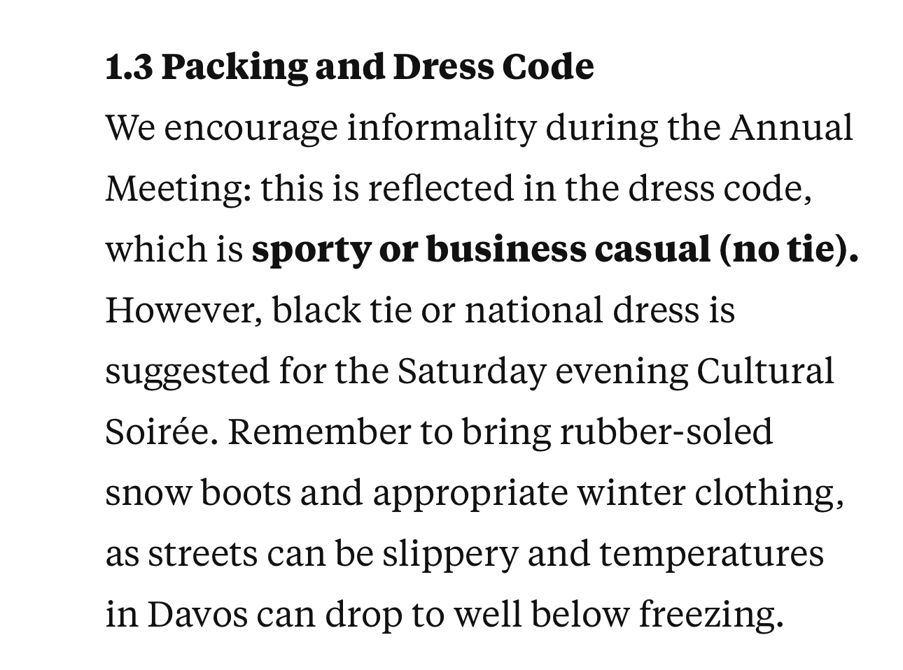 If, on the other hand, my invite arrives late in the mail, I’m packed and ready to go, thanks to Business Insider’s guide to proper attire at Davos.